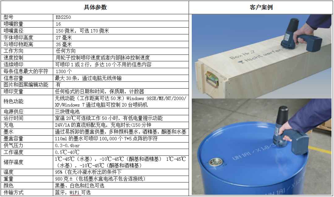EBS 250手持大字符噴碼機(jī)可在各種光滑、多孔的或是粗糙的物體表面打印出清晰持久的噴碼(如管道、 桶、 袋、 箱、 施工材料等)