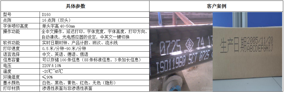 D160大字符噴碼機特點* 外觀經(jīng)典,時尚實用 * 寶石噴片,堅固耐用 * 字高11~20000mm可選 * 可選配單機或多臺組合